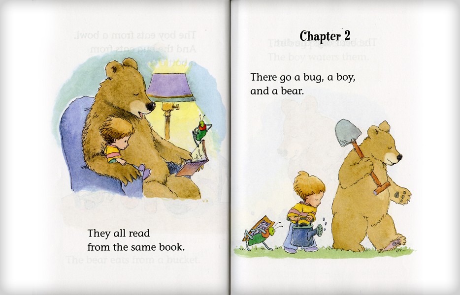 Texts focus on a simple story line or single idea, with direct correspondence between text and pictures; one or two lines of print per page, with a variety of punctuation; many texts at this level feature repeating patterns in the text.